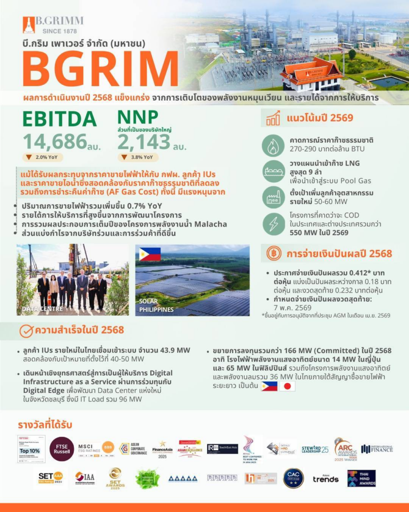 บี.กริม เพาเวอร์ โชว์ผลการดำเนินงานปี 2568 แข็งแกร่งพอร์ตพลังงานหมุนเวียนเติบโตสูง ลูกค้าอุตสาหกรรมขยายตัวต่อเนื่อง