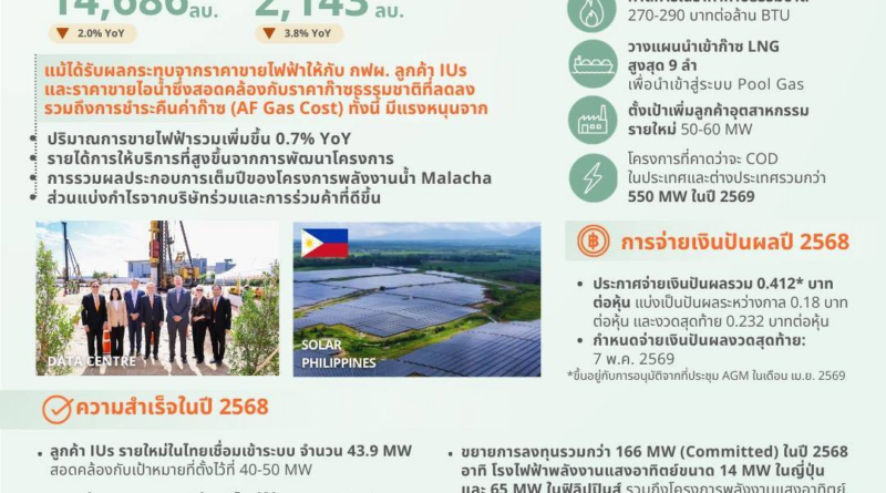 อย่างไรก็ตาม ผลกระทบดังกล่าวได้รับการชดเชยบางส่วนจากปริมาณการขายไฟฟ้ารวมเพิ่มขึ้น 0.7% จากปีก่อน มาอยู่ที่ 15,284 กิกะวัตต์-ชั่วโมง โดยมีแรงหนุนจากปริมาณไฟฟ้าที่เพิ่มขึ้นจากพลังงานหมุนเวียน อาทิ โรงไฟฟ้าพลังงานแสงอาทิตย์ในประเทศไทย โรงไฟฟ้าพลังน้ำในสหรัฐอเมริกาและ สปป.ลาว เป็นต้น รวมถึงรายได้การให้บริการที่สูงขึ้นจากการพัฒนาโครงการ การรวมผลประกอบการเต็มปีของโครงการ Malacha และส่วนแบ่งกำไรจากบริษัทร่วมและการร่วมค้าที่ดีขึ้น